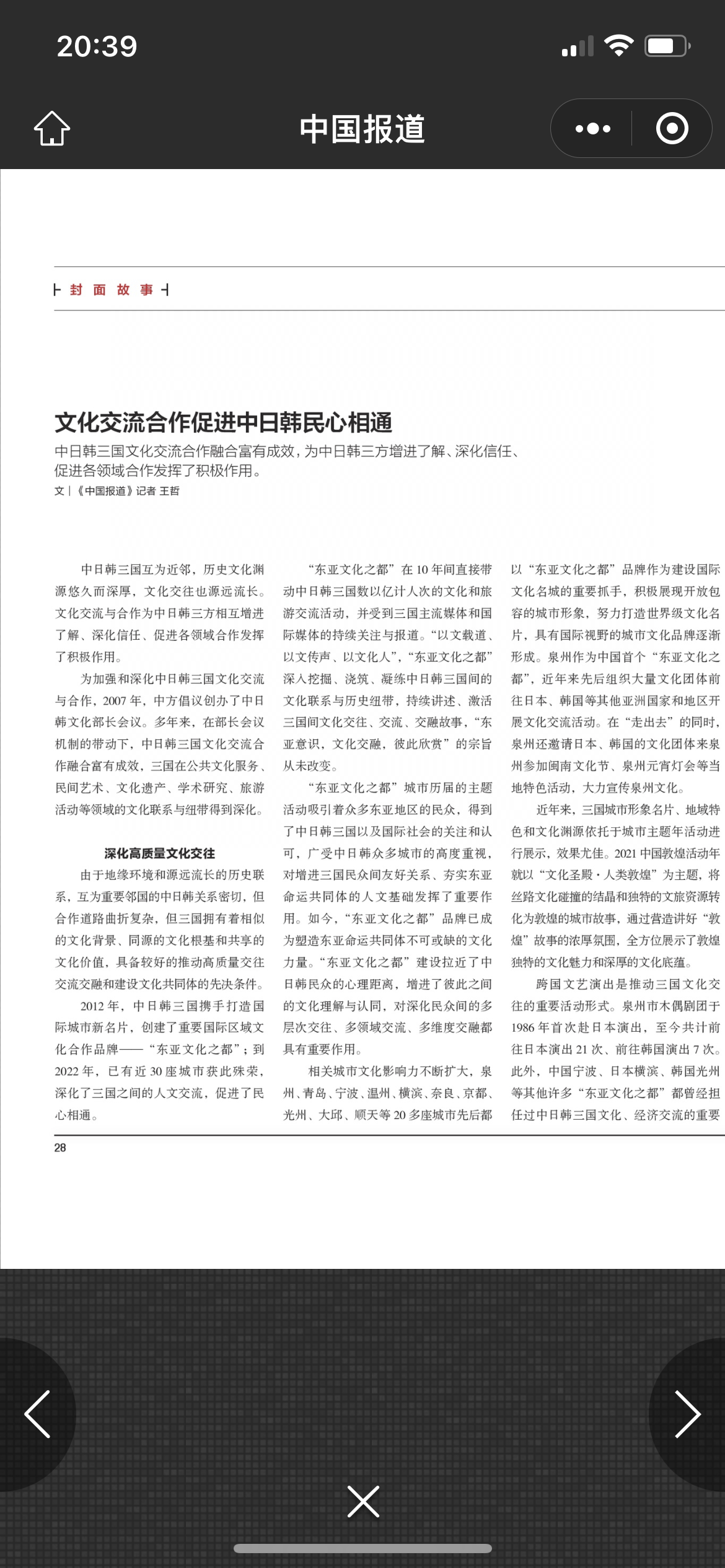 近日,《中国报道》刊发了题为《文化交流合作促进中日韩民心相通》的文章。